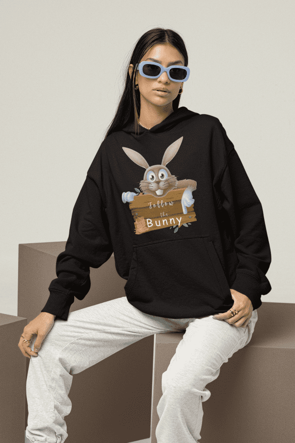 - Black hoodie with “Follow the Bunny” theme printed on front and back.