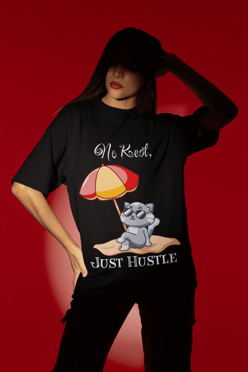 For those who hustle hard but never compromise on comfort, the No Rest, Just Huddle – Chill Cat Edition oversized T-shirt is the perfect fit. Crafted from premium cotton, this ultra-soft black tee delivers unbeatable breathability and a relaxed streetwear aesthetic. The oversized cut ensures a loose, modern look, making it a go-to for casual days or laid-back outings. The unique graphic features a chill, relaxed cat, embodying the balance between grind and relaxation. Whether you’re hitting the streets or lounging at home, this tee is your statement piece for effortless style.